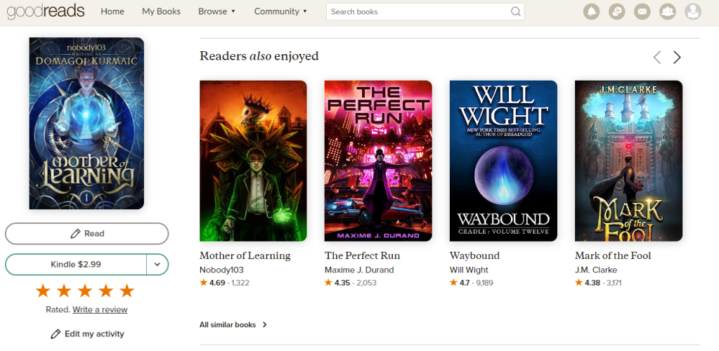 You can mark each book with a shelf tag, seen above. These are ways to group books you’ve read. I like to mark things with sub genres, number of POVs, whether or not something is progression fantasy, ect and I use this to help sort when recommending books to others.