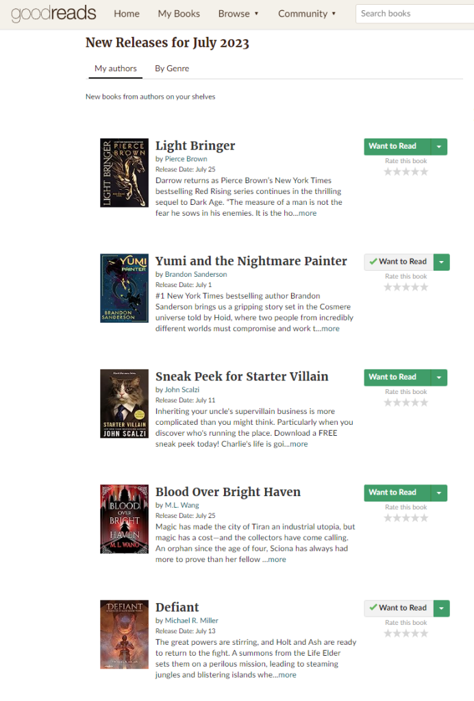 This page will show you, month by month, all the books coming out by authors you’ve already read. You can even look at past months to see if you missed any. I get in the habit of checking this list out every couple weeks and updating my want to read list.