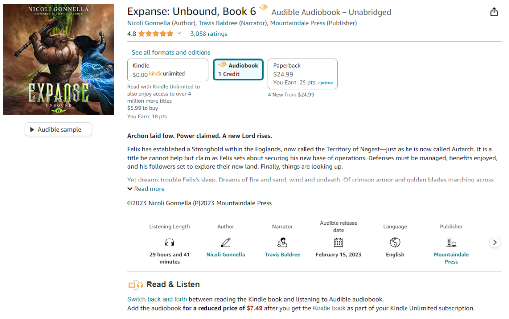 Brandon Sanderson does a good explaination of why Audible kind of sucks and I suggest everyone read it. I’m going to ignore all that for the purposes of this post, but it is important to keep in mind that Audible takes 60% of the sale of audiobooks If you are exclusive to them and 75% if you you aren’t. So, if you want to support an author, paying $60 for their audiobook is a pretty bad way of doing it.